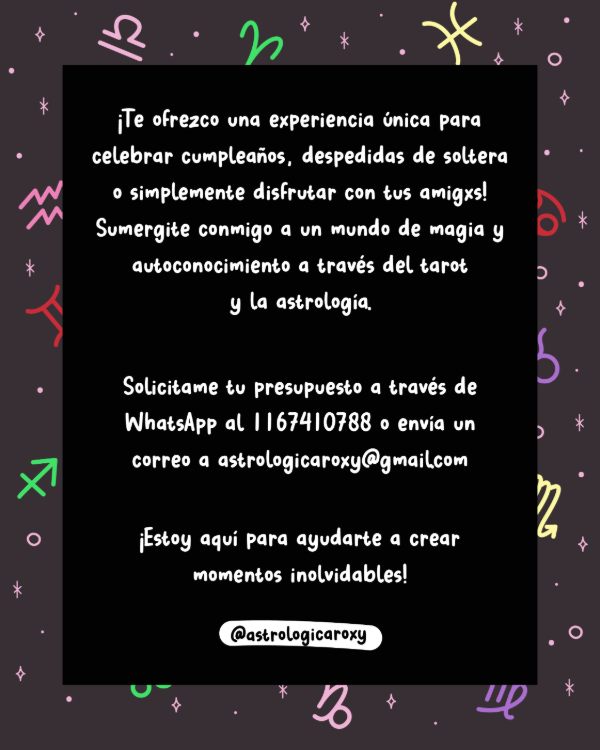 ¡Te ofrezco una experiencia única para celebrar cumpleaños, despedidas de soltera o simplemente disfrutar con tus amigxs! Sumergite conmigo a un mundo de magia y autoconocimiento a través del tarot y la astrología.