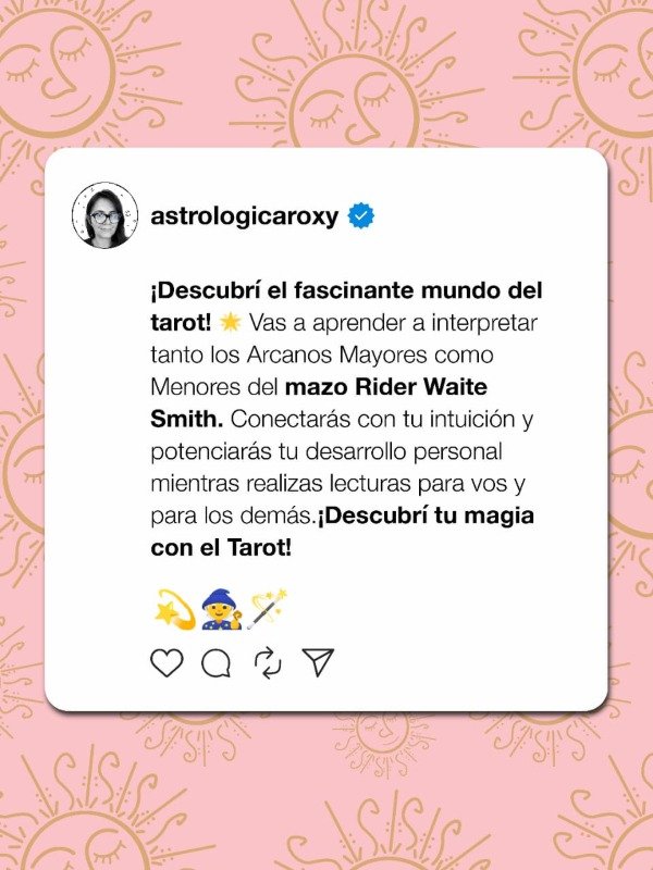 🔮 Vas a aprender a interpretar tanto los Arcanos Mayores como Menores del mazo Rider Waite Smith. Conectarás con tu intuición y potenciarás tu desarrollo personal mientras realizas lecturas para vos y para los demás.